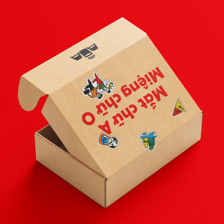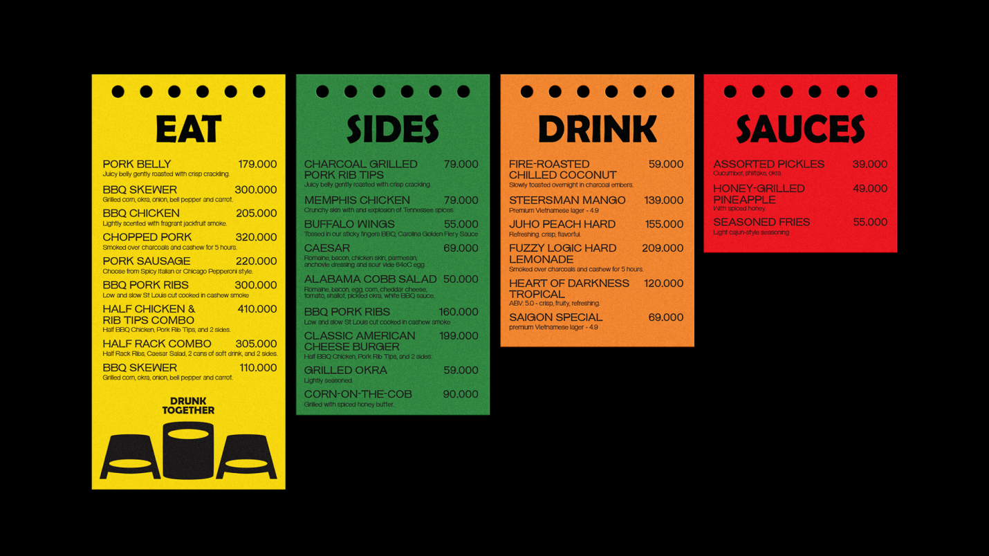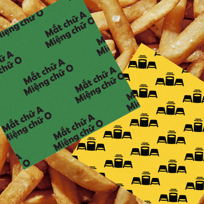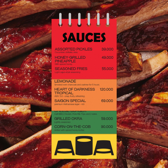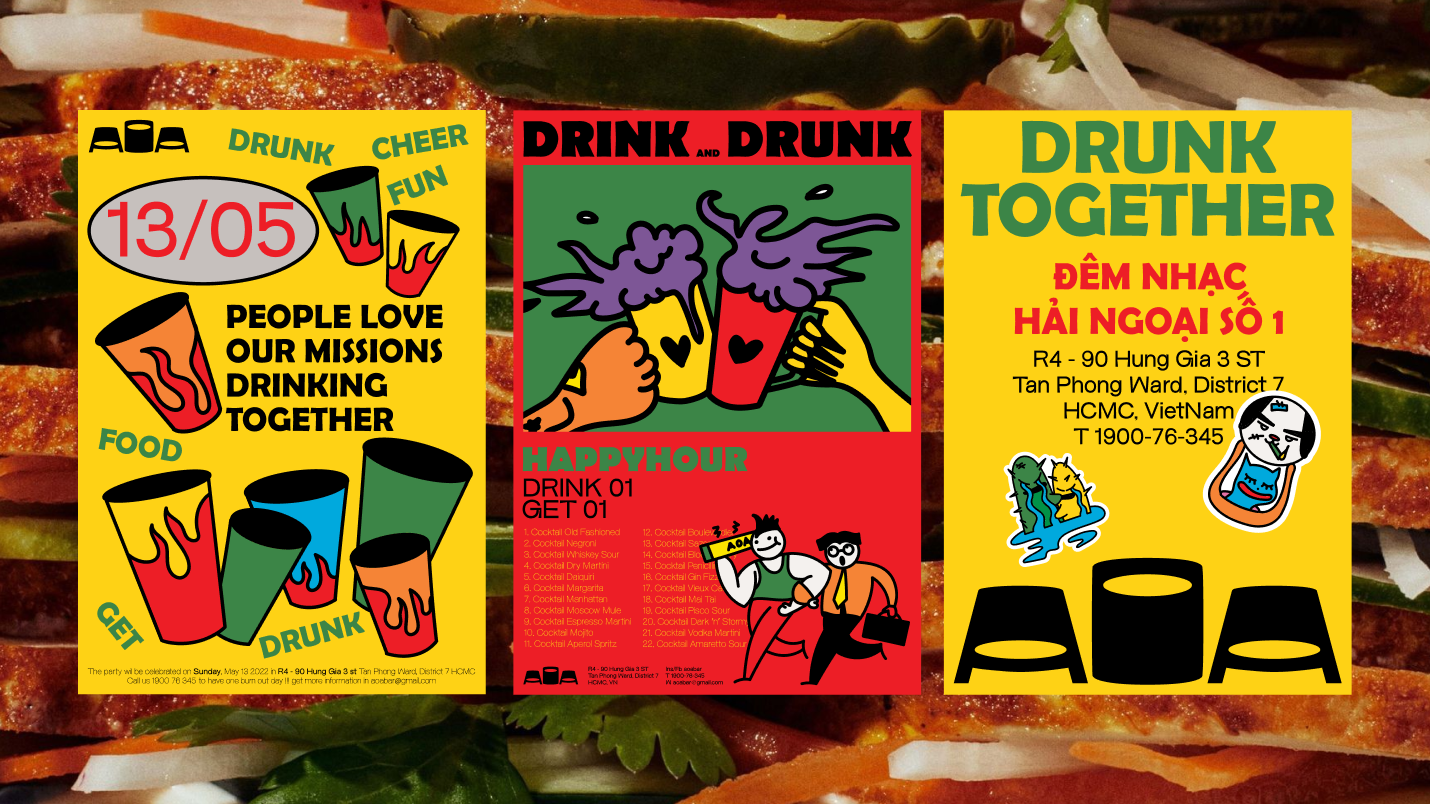 AOA (Mat chu A, Mieng chu O) is a BBQ joint inspired by American Culture, catering to young crowds. More than just a place to gather and eat, AOA is where people can share moments of joy and sorrow together over a table of grilled delights. All these spirits are embodied through a vibrant, cheerful, and positive visual system, always accompanying each other like “drunk together”.